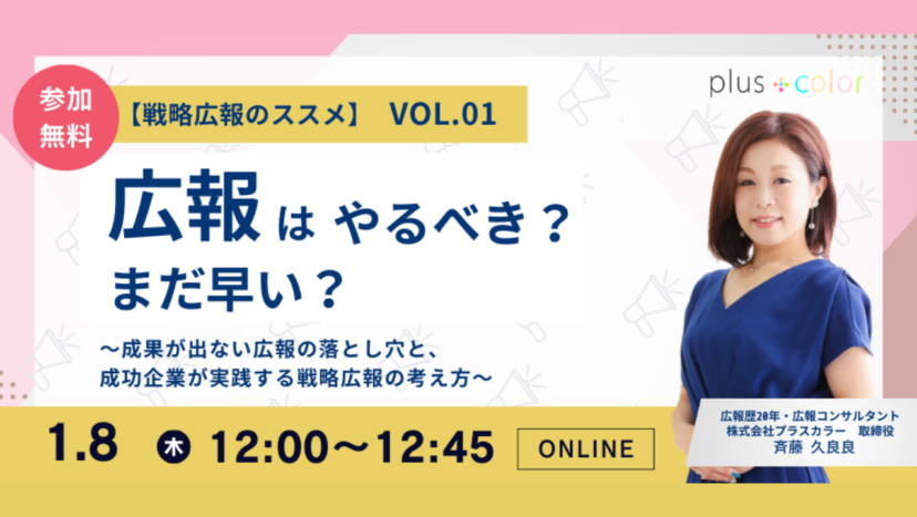 【ウェビナー開催】2026年1月8日(木)12:00◆【戦略広報のススメ vol.01】広報はやるべき?まだ早い? 〜成果が出ない広報の落とし穴と、成功企業が実践する戦略広報の考え方〜