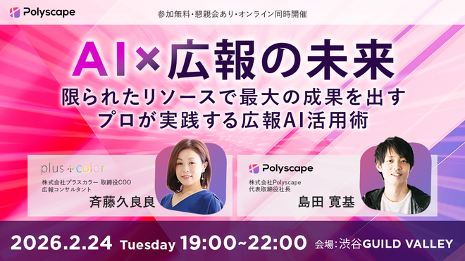 【共催ウェビナー開催】2026年2月24日(火)19:00◆オフライン/オンライン◆AI×広報の未来 -限られたリソースで最大の成果を出す!プロが実践する広報AI活用術-