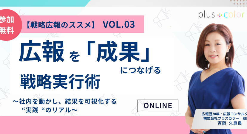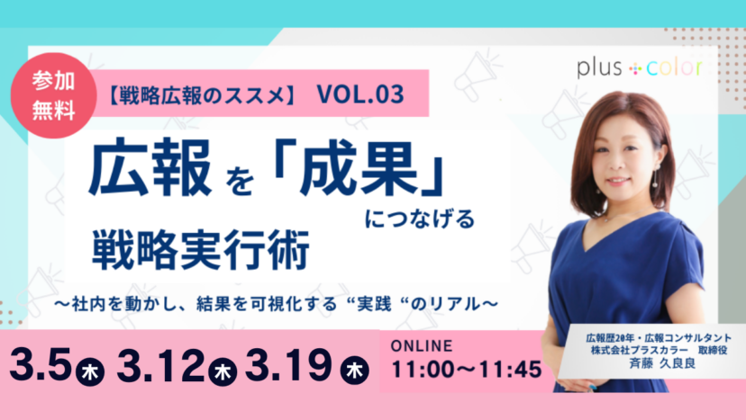 【ウェビナー開催】3/5(木)3/12(木)3/19(木)11:00◆【戦略広報のススメ vol.03】広報を「成果」につなげる戦略実行術 〜社内を動かし、結果を可視化する“実践”のリアル〜