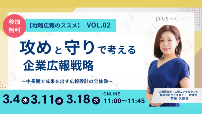 【ウェビナー開催】3/4(水)3/11(水)3/18(水)11:00◆【戦略広報のススメ vol.02】攻めと守りで考える企業広報戦略 〜中長期で成果を出す広報設計の全体像〜