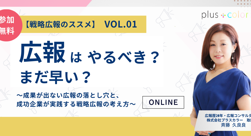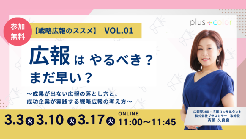 【ウェビナー開催】3/3(火)3/10(火)3/17(火)11:00◆【戦略広報のススメ vol.01】広報はやるべき?まだ早い? 〜成果が出ない広報の落とし穴と、成功企業が実践する戦略広報の考え方〜