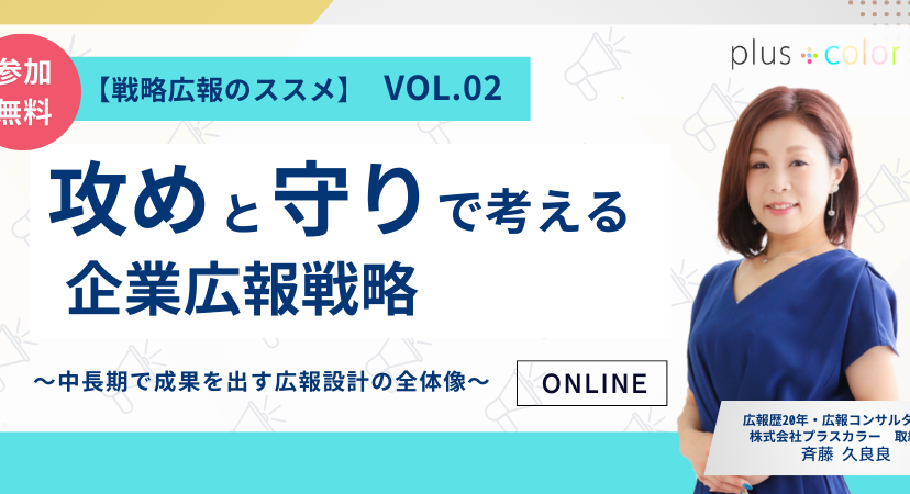 【ウェビナー開催】2/4(水)2/12(木)2/18(水)11:00◆【戦略広報のススメ vol.02】攻めと守りで考える企業広報戦略 〜中長期で成果を出す広報設計の全体像〜